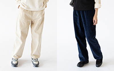 デザインは、ゆるすぎずきつすぎない、あくまでイージーパンツとして機能しながらも、スタイルアップを叶えるテーパードスタイルに。昨年販売したコーデュロイパンツよりも少し丈を伸ばしているので、よりゆったりとリラックスした雰囲気になっています。