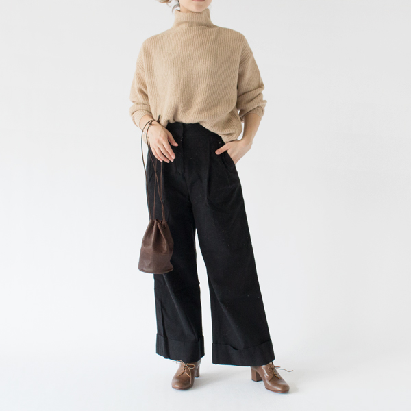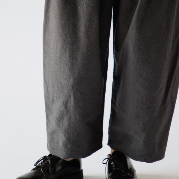 フロントに大きく入れたタックと、裾に施したダーツ。この二つのラインが、ゆったりとした穿き心地の中に美しい立体感を生み出しています。