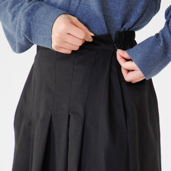 スカートには、左脇にコンシールファスナーを入れています。ファスナーは表から見えにくい仕様なので、腰まわりはすっきり。綺麗なシルエットを保ちます。
