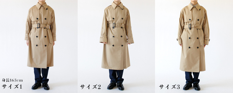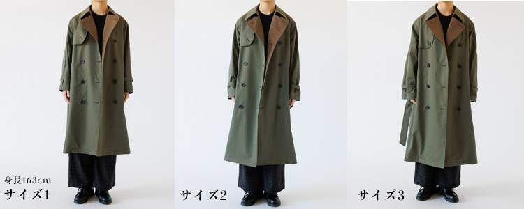 コートのサイズとしては、身長158cmくらいまでの方がジャストサイズで着るならサイズ1、身長160cm前後の方ならシルエットに合わせて1〜2、ゆったりばさっと羽織りたい方や160cm以上の方でしたらサイズ3くらいまでがおすすめです。