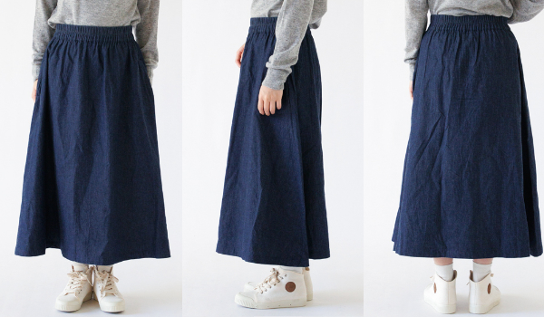 ふくらはぎの少し下あたりに裾がくる長さで、長すぎず短すぎずのちょうど良い丈感です。デニムスカートというと窮屈感のあるものが多いですが、ウエストは総ゴムなのでリラックスして穿けるのがよかった点。かなり軽いデニムなので、穿くと見た目の分量ほど重たくはなく、長時間穿いても疲れませんでした。またウエストベルトが太めのデザインでアクセントにもなるので、トップスをインして綺麗めなコーディネートにも使ってみたいです。