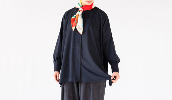 まずは共通のかたちから。ベースは、日常に取り入れやすいスタンドカラーのシャツです。ボディはゆったりとしたオーバーサイズでありながら、袖はすっきりと細めに設計しました。
