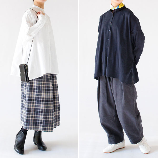 左:コットンポプリン スタンドカラーシャツ、右:オーガニックコットン天竺×布帛ドッキングスタンドカラーシャツ