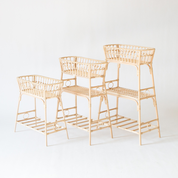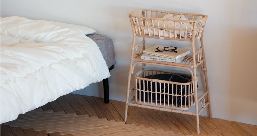 【別注】籐 3段ラックサイドテーブルは、天板のお掃除をしやすくするため、天板(一、二段目)のみ籐の風合いを残したラッカー塗装を施しました。その他は無塗装で仕上げ、サイドテーブルとして他のシリーズと一緒に使っても違和感がない仕上がりです。白くてマットな風合いが軽やかなので、リビングのフローリングや玄関・キッチンのタイル、ベッド横にもよく合います。