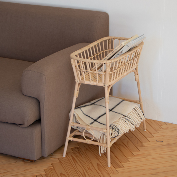 ZUTTOとツルヤ商店とで相談を重ねて出来上がった、【別注】籐 3段ラックサイドテーブル。見た目の素敵さだけでなく、籐の軽さや扱いやすさから、これくらいの大きさのテーブルがあれば、お部屋でのくつろぎ方に合わせた使い方も楽しめますよ。