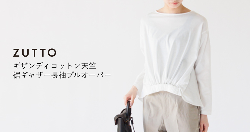 ZUTTOオリジナルの「ギザンディコットン天竺 裾ギャザー長袖プルオーバー」は、上品な光沢のある天竺素材と、フロント裾のギャザーがつくる立体的なシルエットが魅力。体型を包み込みながらも、すっきりと見えるバランスにこだわった一着です。
