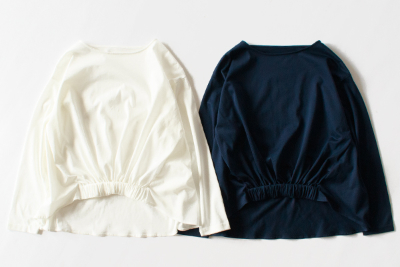 また、前身頃は短めにしてもたつかず軽やかに、身頃はやや長めのヒップにかかる丈感で前後差のある着丈にしています。「全部をインするスタイルはちょっと苦手」「裾を出すと間延びしてしまう」そんな時でも、ギャザーがあることで前だけ軽くタックインしたような見え方になります。コーディネートのまとまりやすさもこの服の魅力です。