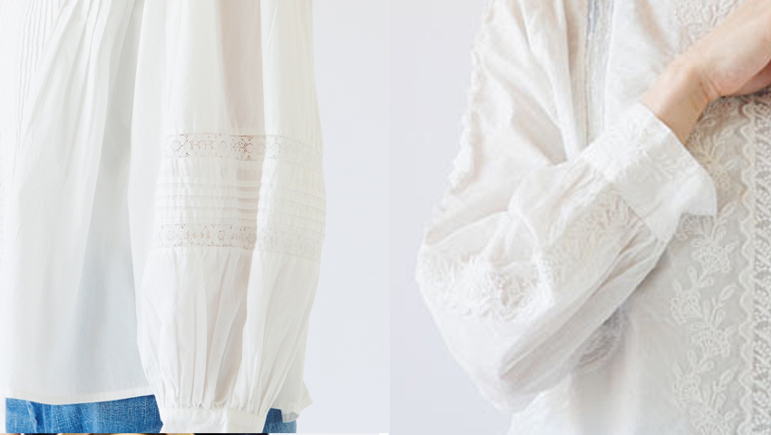 ご紹介するリバーレースブラウスには、クラフト感のあるディテールや、手仕事ならではの繊細なデザインが多く取り入れられています。その多くはインドの工場で生産されています。