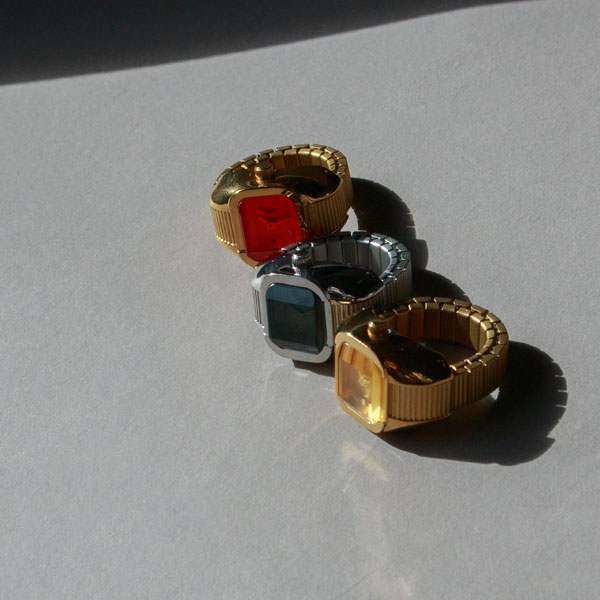 リングというとサイズ選びが難しいものですが、こちらのリングウォッチは伸縮性のあるバンドのため、1サイズ展開でも幅広い方に身につけていただけます。