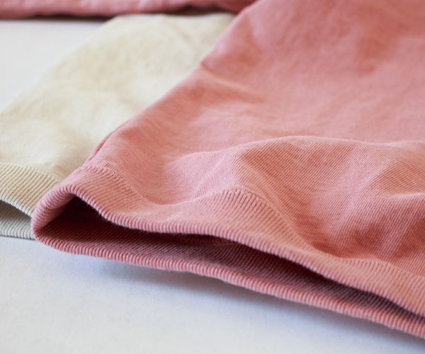 吊り編み機は、糸に余計な負担をかけずに編めるため、生地が均一に仕上がります。その結果として生まれるのが、型崩れしにくく、洗濯を繰り返しても歪みにくいという実用的な強さ。ハリのある生地、立体感も、この工程から生まれています。