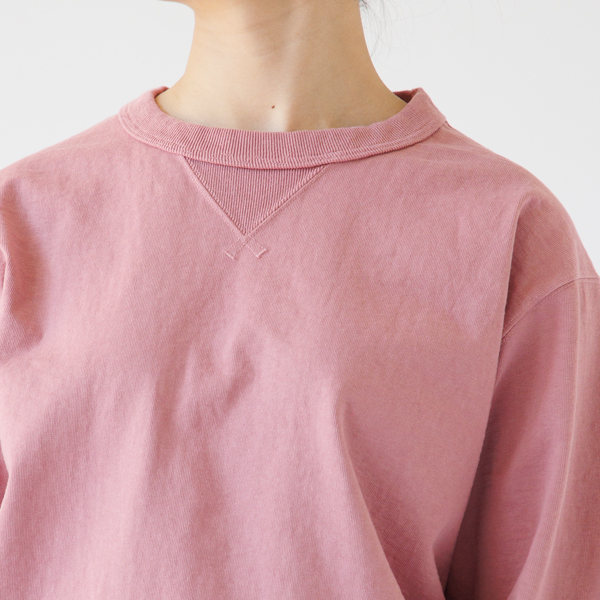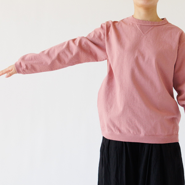 落ち着いたトーンのピンクで、可愛らしくなりすぎない絶妙なカラー。半袖で展開されているカラーを、より長いシーズン着られるロングスリーブで作っていただきました。差し色としても取り入れやすく、装いの幅をさりげなく広げてくれます。