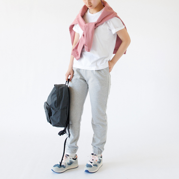 インナー:選べる白Tシャツ(ハイゲージ/薄手)、パンツ:スウェットジョガーパンツ、シューズ:シンクロンクラシック KH802674、リュック:10th LIMITED SIMPLICITY LAMB / バックパック DAYPACK S