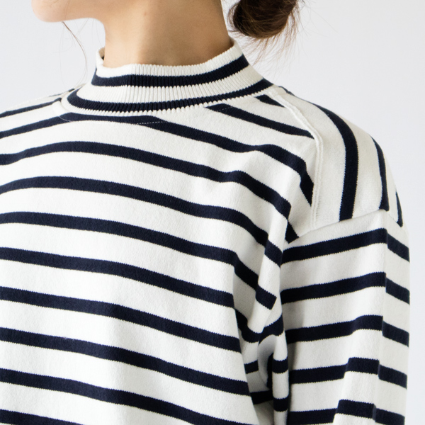 WAVE COTTON バスクニット モックネック WHITE/NAVYはモックネックで、襟部分は同じボーダーのリブ編みになっています。程よくフィットし窮屈感がないので、タートルネックが苦手な方にもおすすめです。日本のものづくりが好きな方、着始めから心地よいものを探している方、気兼ねなく長く着られるバスクシャツを探している方にお選びいただきたい一着です。
