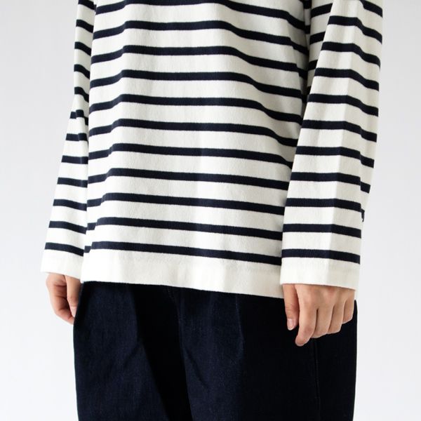 また、お洗濯に強いというのも普段着に嬉しいポイント。ニットですが、生地の段階で洗いをかけているので、縮みを心配せずにご家庭でお洗濯していただけます。バスクシャツというと着始めは硬いものも多いですが、最初から柔らかな着心地。ニットなので横方向に伸縮性があり体によく馴染みます。