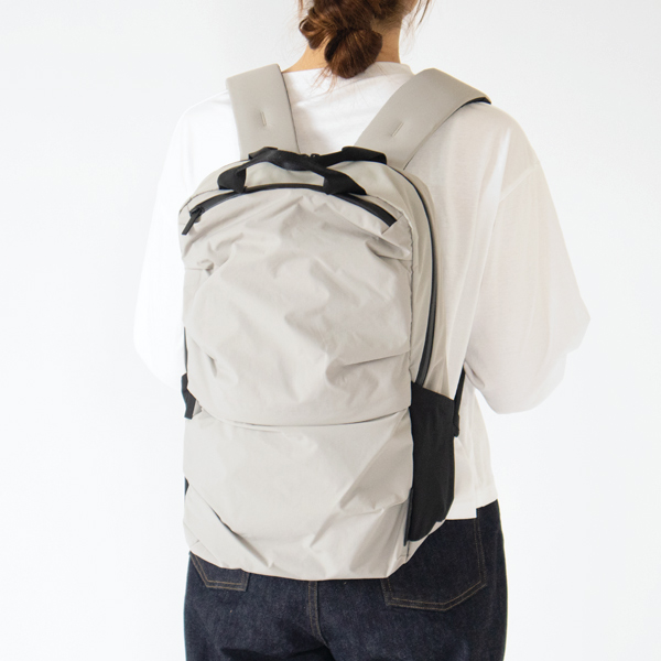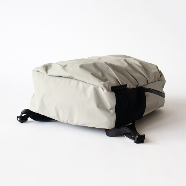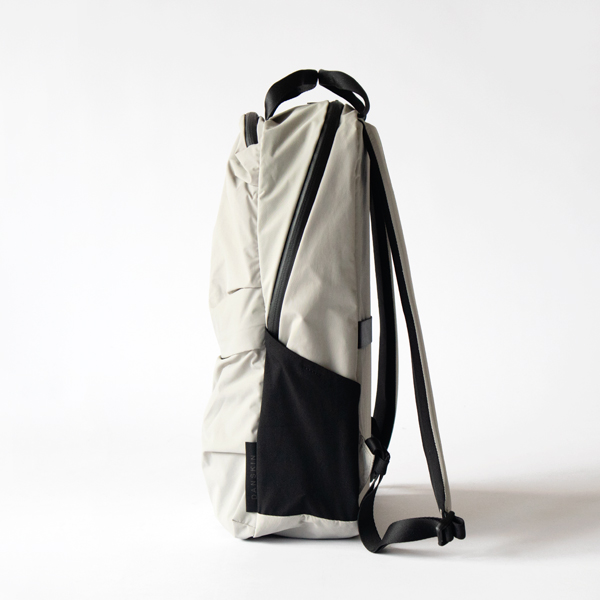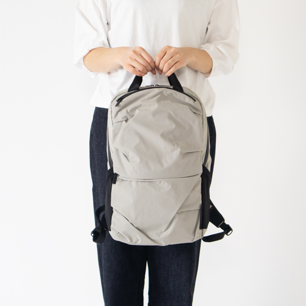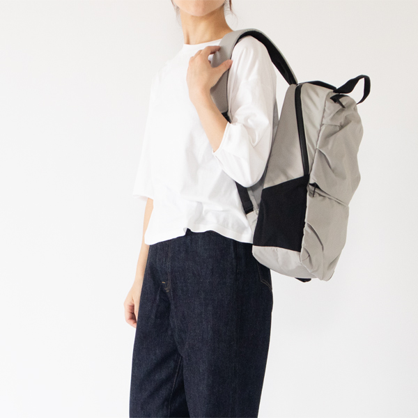 このバックパックは、アシンメトリーに畳んで縫われたタックが、不規則な膨らみと曲線を生み出し、柔らかくしなやかな印象で、スポーツバッグとは異なる女性らしさがあります。