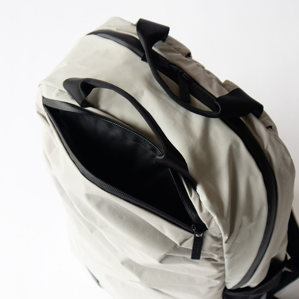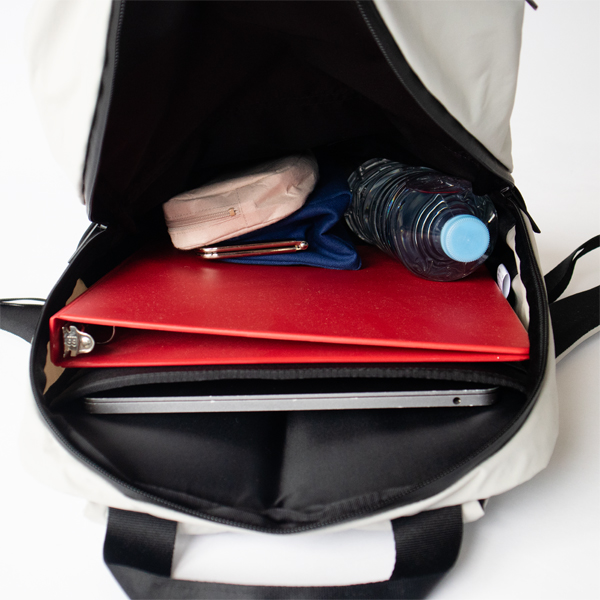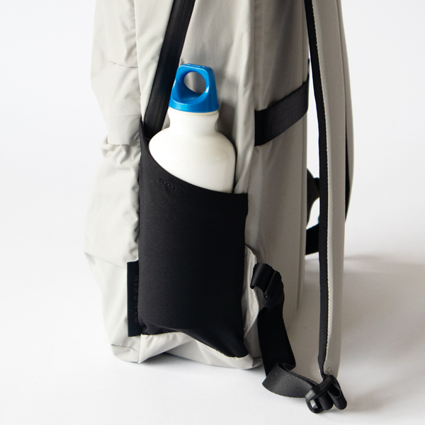 ペン類を刺すことができる箇所もあって、さっと取り出したい細かなものも定位置に収納。メインコンパートメントには、ノートPCや書類など、ビジネスツールに適したスクエアフォルムのポケットが、クッション性のあるスリーブで付いています。サイドポケットは、ストレッチナイロン素材で、ペットボトルやタンブラーを入れたり、折畳み傘を入れておけるので便利です。