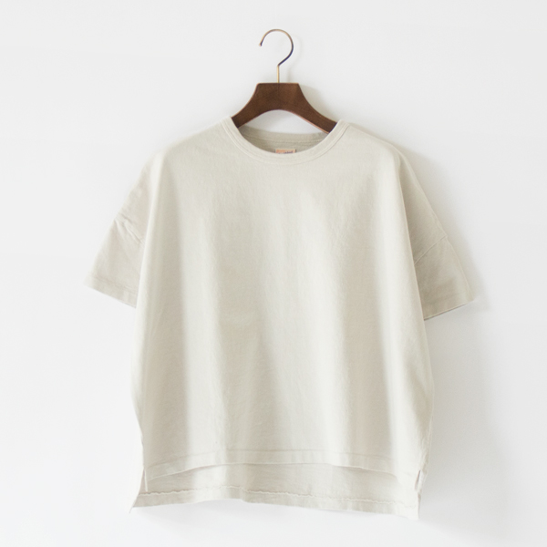 素材には、ざっくりとした粗野な表情を持ったUSAコットン生地を使用しています。米綿でも少し柔らかみのある素材感で着心地がよいのが特徴で、それでいて下着が透けたりしないしっかりとした生地厚のため夏に一枚で着やすくなっています。洗っていくとさらに馴染んで柔らかくなる点でも、夏場に活躍させるのが楽しみなTシャツです。