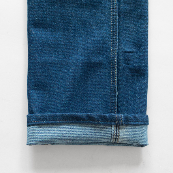 スリムテーパードデニムパンツは、前身を狭めにデザインすることで、スタイル良くすっきりと見えるようになっています。テキサスのコットンのみ使用の単一混綿をノースキャロライナの工場で織りあげたデニム生地は頑丈さとしっかりとした厚みがあり、そして軽いという特徴があります。この生地を3本針で巻き縫いをすることでさらに強度を持たせ、長い間穿くことが可能になりました。その他にも、ジップやリペットには銅を使用したり、バックスタイルも綺麗に見せる大きめポケットをつけたりと、パーツにもこだわっています。