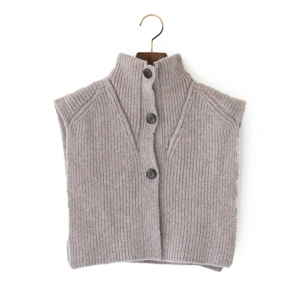 肩や背中を覆う袖なしのアウターといったところのパネルケープは、シンプルに前身頃と後身頃にネックがついてポンチョほどボリューム感もなく気軽に洋服に合わせられる肩と背中のベスト。厚手ニットを着た時の一回り大きくなる上半身の心配なく暖かなアイテムです。