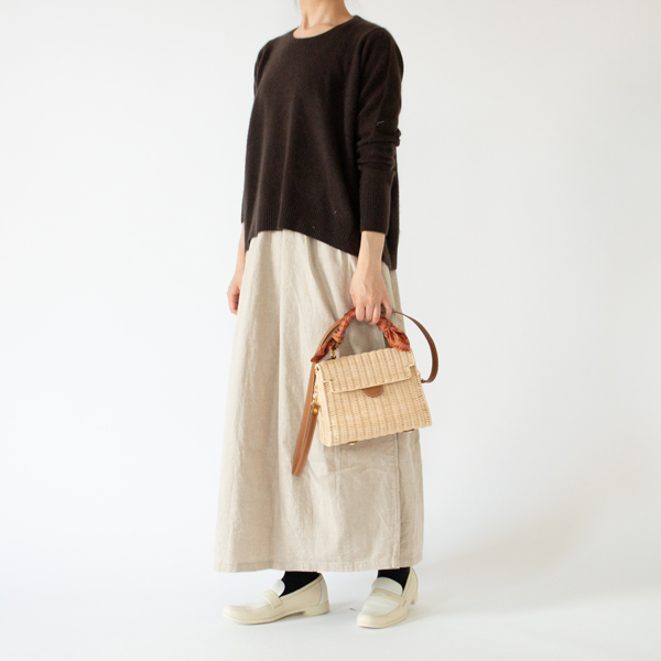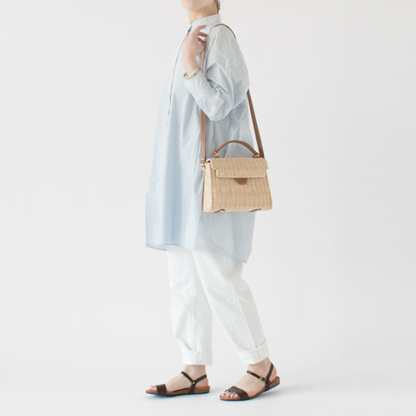 かっちりとしたボディにレザーが往年の女優のような上品さ。フラップまで全て籐素材のものは春夏らしく爽やかな印象で、かご好きの方などは、やっぱり暖かい時期のカゴバッグと言ったらこれ!と思われるかもしれません。こちらはハンドルとショルダーどちらもレザーでできていて、全てホワイトのステッチを入れてもらうように別注しました。