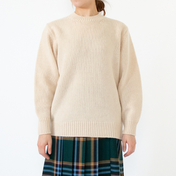 今回はそんなソフトラムウールニットをZUTTOのお客様に向けて色別注させていただく機会がいただけました。こちらの色は別注IVORY。ナチュラルで肌馴染みのいいIVORYカラーはとても使い勝手が良く優しい雰囲気で、ブランドの定番色でないのが不思議なくらい。しっかりと目の詰まったニットなので、ほっこりしすぎないのも○。女性ができるだけジャストサイズで着たいなら1がおすすめですが、中にシャツを着たり大きめで着たい場合は2〜3と、サイズを上げてみるのも良いですよ。ZUTTOでは2サイズが一番人気ですが、その次は1と3を選ぶ方が同じくらいいらっしゃったので、3サイズの展開でご用意しています。ユニセックスサイズなので、もちろん男性にもお選びいただけます。