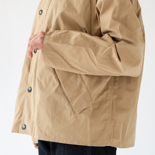 ジップとスナップボタンのフロントデザインで、ハンドウォーマーポケットも備えています。メンズライクでも男性的によりすぎず、コンパクトなバランスがスタイルを選ばず上品なコーチジャケットのような印象で汎用性に優れるコートです。