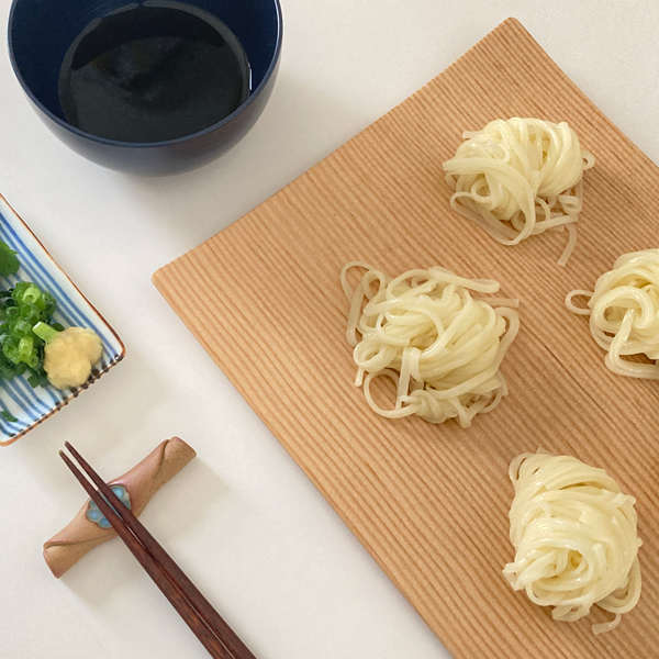 加工性・耐久性に優れた素材と、適度な硬さがあるのが特徴で、緻密でシャープな木目が美しく、食卓に凛とした雰囲気。陶器だけでなく、木やガラスなど素材の異なるプレートやお椀でテーブルをコーディネートすれば華やぎますし、いつも同じものを使うマンネリ化も防げますね。