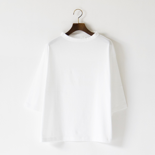 ドロップショルダーのゆったりとしたシルエットのボトルネックTシャツ 3/4SLEEVE。ボトルネックに浅めのネックライン、着てみると細部までこだわったデザインであることがよくわかります。袖は、肘よりも少し長い7分丈で、毎年着るものに悩んでしまう季節の変わり目に重宝する一着です。身幅や袖口もゆったりとしているので風通しがよく、汗ばむ日にも快適に着られるのがうれしいところ。季節ごとに色を追加して、年を重ねても長く愛用していきたい自分の定番になる一着です。