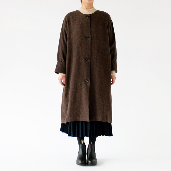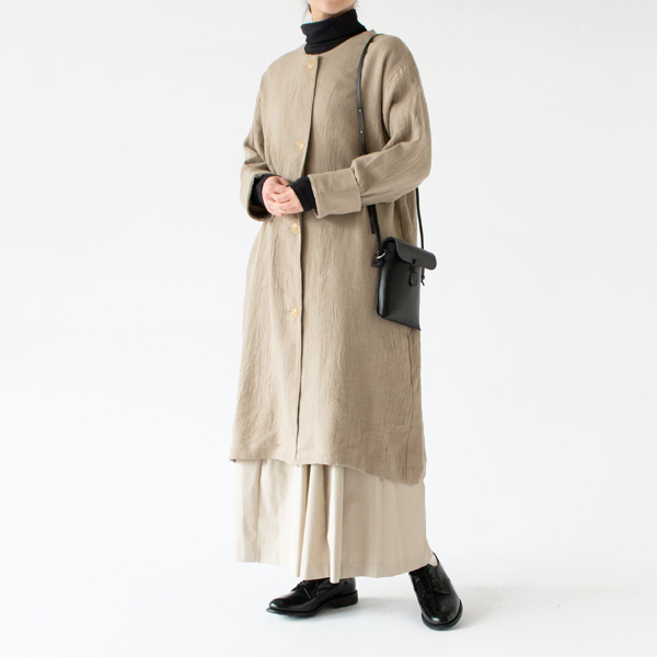 リネンとウールを混ぜ合わせた素材は、見た目の軽やかさに暖かさの加わった機能性にも優れるもの。さらに織り目がわかりやすいことで、無地でも表情があるのが素敵です。大人が品よく着こなせるシンプルさと、中に着る物を選ばずコーディネートに合わせやすいライトコートに仕上がりました。