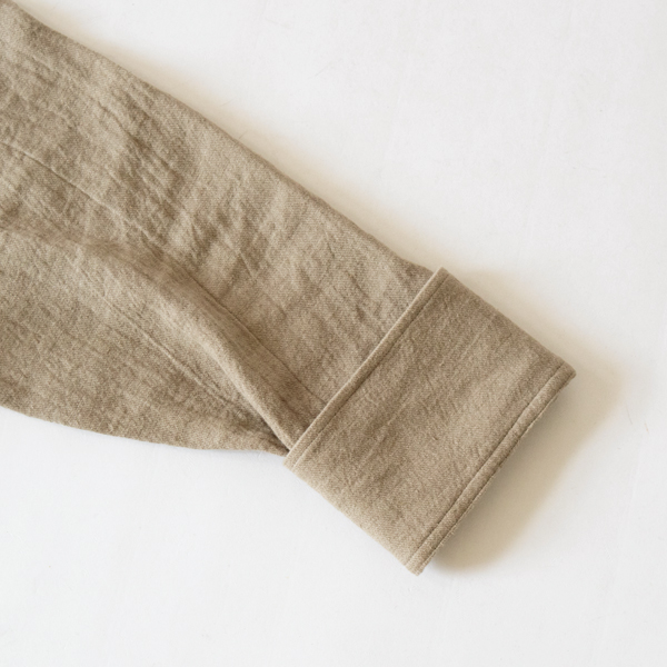 カジュアルに寄りすぎないよう、シャツライクなディテールを取り入れています。一つめは、背中の切り替えのヨーク仕様と、ヨーク下のタック。このおかげで柔らかい生地のドレープが美しく現れ、どの角度から見てもふわりと立体感があり、生地の揺れるシルエットになっています。二つめは、袖元。袖は基本折り返して着られるように長めに作っていますが、手元を素敵に見せるさりげないポイントとして太幅の袖口カフスを採用しました。両脇にはシームポケットも付いて便利です。