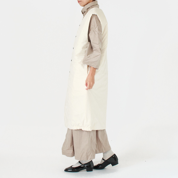 また、アームホールが大きめになっていますので、ドロップショルダーの洋服とも窮屈なく着ることができるのも便利な点です。冬の羽織ものというと、組み合わせによっては、袖や肩周りが窮屈になって重ね着がしにくいということもありますが、このロングベストはアウターの上に重ねても、インナーとしてもどちらでも使える便利です。洗いにかけた風合いあるコットン100%生地はナイロン生地とも異なり様々洋服合わせがしやすく、秋から春先まで長く着用いただけます。