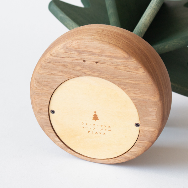 オルゴールが入っているのは幹の下にある鉢の中。鉢を押さえて、幹の根元をくるくると回すと、オルゴールの音色でWe wish you a Merry Christmasが響きます。さらにツリーに付ける飾りはセットとして含まれていますので、木の実やガラスのオーナメントを一つ一つ飾って素敵なツリーに仕上げてください。クリスマス時期には、トップに星の飾り、サンタのコインや赤色のフェルトボールを飾ってクリスマスカラーをメインに。普段は、トップをボール型の飾りにして、木の実や木のボールを飾ってインテリアに。とオーナメントの種類が増えたことで通年楽しめるインテリアになっています。