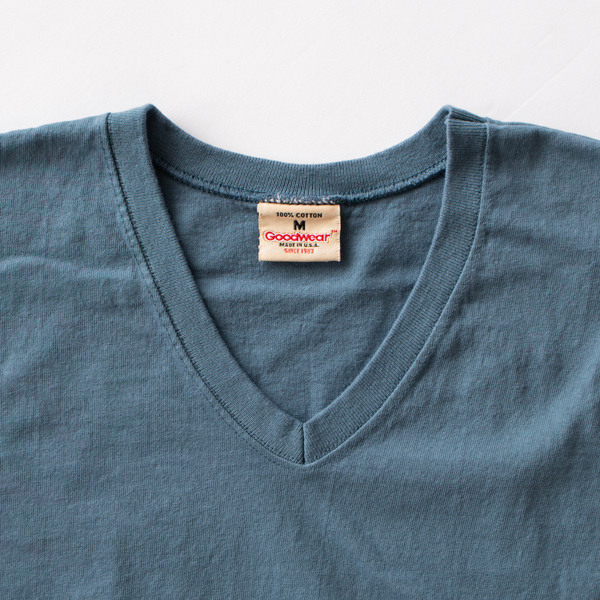 手に取ってみると、少し厚みをも感じるGoodwear(グッドウエア)のVネック ショートスリーブ Tシャツ。それもそのはず、7.2オンスというTシャツにしては肉厚の部類に入る生地を使用しているからです。肉厚といっても、分厚く暑苦しいということではなく、丈夫で簡単にくたびれることはなさそうという安心感があり、透けにくく一枚で着ることができます。Vネック ショートスリーブ Tシャツは袖口と裾がリブになっているので、全体的に少し丸みを帯びた印象。袖を通してみると、腕やお腹の辺りに少し余裕を感じさせてくれるサイズ感です。
