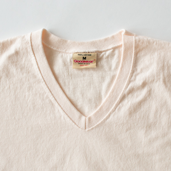 手に取ってみると、少し厚みをも感じるGoodwear(グッドウエア)のVネック ショートスリーブ Tシャツ。それもそのはず、7.2オンスというTシャツにしては肉厚の部類に入る生地を使用しているからです。肉厚といっても、分厚く暑苦しいということではなく、丈夫で簡単にくたびれることはなさそうという安心感があり、透けにくく一枚で着ることができます。Vネック ショートスリーブ Tシャツは袖口と裾がリブになっているので、全体的に少し丸みを帯びた印象。袖を通してみると、腕やお腹の辺りに少し余裕を感じさせてくれるサイズ感です。