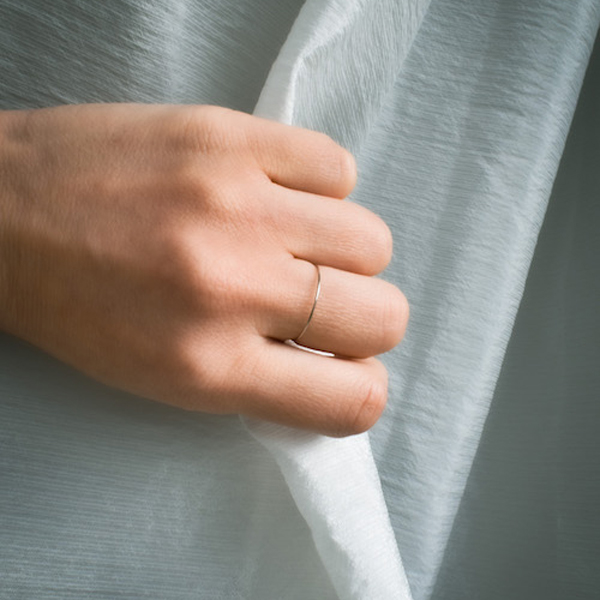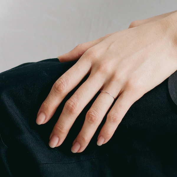 こちらのリングは、肌に溶け込むような繊細なスキンジュエリーの印象で日常使いにぴったり。金属を伸ばして叩く工程を繰り返し、強度を高める鍛造製法で作られています。この製法は、ブライダルリングなどのハイジュエリーにもよく使用されるもので、表面硬度が高く繋ぎ目がないため、研磨後には均一で美しい輝きが生まれています。