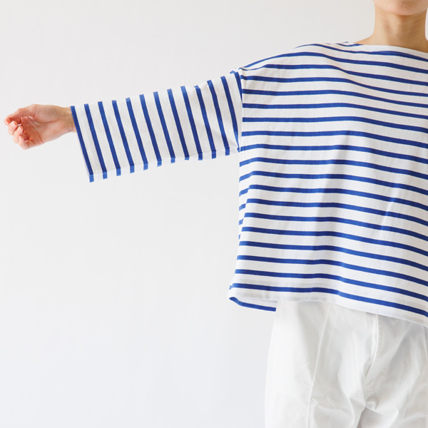春夏の万能着「バスクシャツ」。数多あるバスクシャツの中でも最も有名なブランドの一つがこのLe minor(ルミノア)です。フレンチカジュアルの定番であるバスクシャツは、バスク地方の漁師が着ていたワークウエアが源流で、肉厚の丈夫な生地、ボートネックであることなどが特徴に挙げられることが多いもの。今回Le minor(ルミノア)からご紹介する薄手ドロップショルダー 八分袖バスクシャツは、ブランドの変わらないものづくりを継承しながらも、広めの身幅と袖で、どんな方も着やすく柔らかく仕立てられたカットソー。風も通るので、そろそろ半袖かな。という初夏まで着ていただける薄手の八分袖です。
