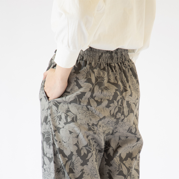 生地には美しいコットンビエラを使用。軽やかな生地なのでフルレングスのパンツに仕立てていても重さを感じず、レイヤードしてもゴワつきにくいのが嬉しいです。プリント図案は植物が描かれたもので、ナチュラルとクラシカルな雰囲気を持つ生地に仕上がっています。