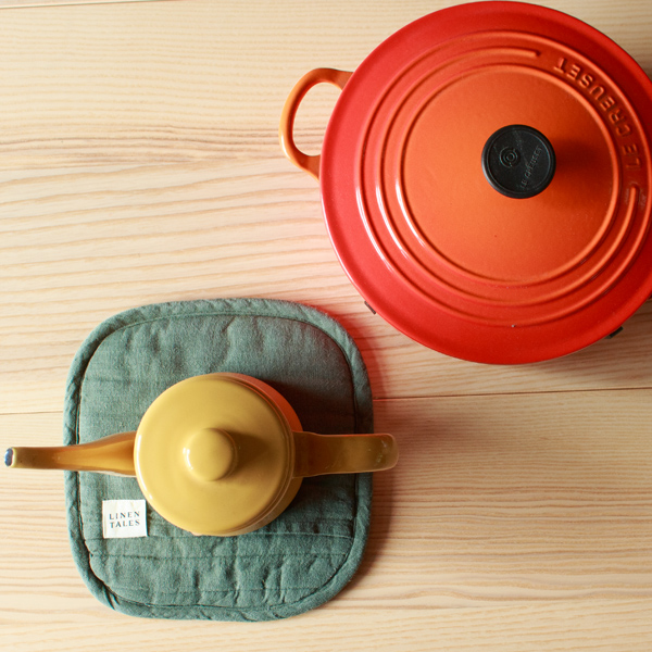 熱くなったポットや急須の置き場として、大切な家具を熱から守ってくれるのがポットマット。そのような機能面としてはもちろん、ポットマットがあることで来客時のテーブルにきちんとした印象も作り出してくれます。ベーシックで使いやすい無地と、キッチンが華やかになるギンガムチェックの4色をご用意しました。同じ柄のオーブンミトンと揃えるのも素敵ですよ。