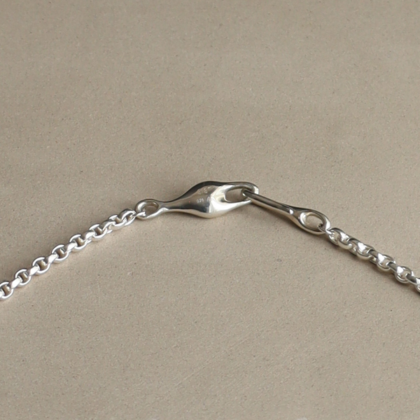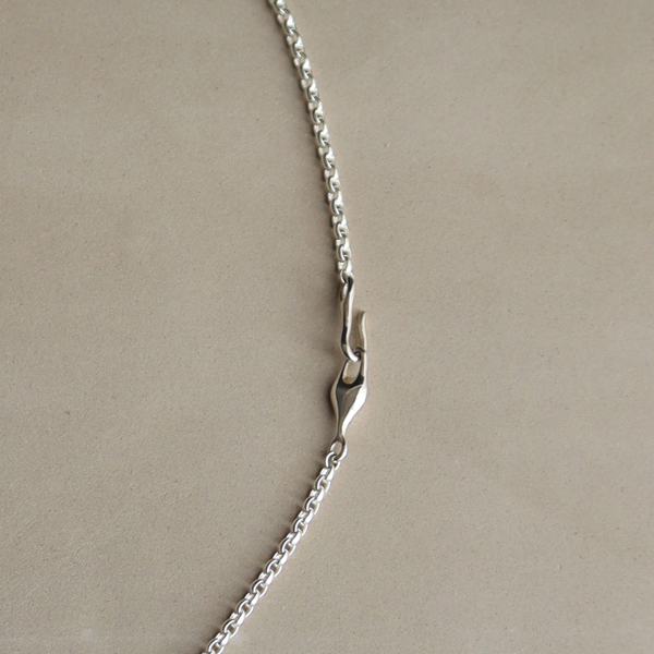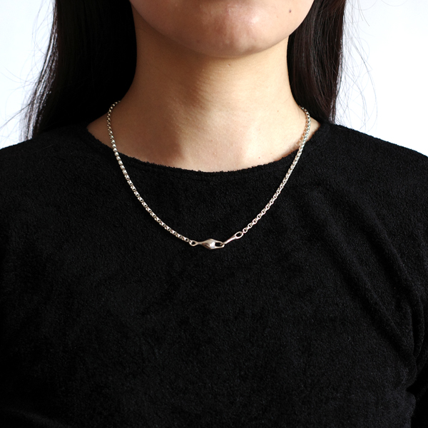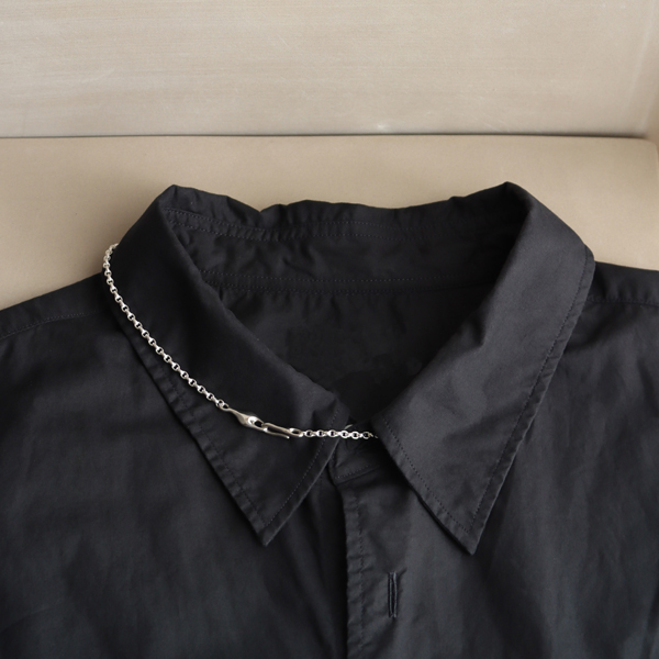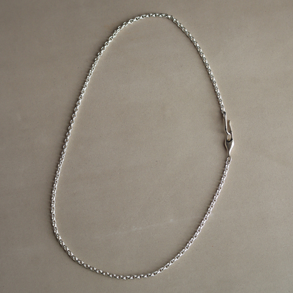 シャツやTシャツなどのシンプルなデザインのお洋服のポイントになるようなチェーンネックレス。留め具はオリジナルで、葉っぱのようなデザインの金具を引っ掛けて使います。シャツの襟元に沿わせてみると、首元にやわらかなアクセントが生まれ、さりげなく印象を引き締めてくれます。