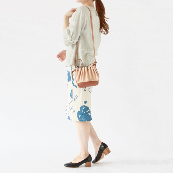 柔らかい彫刻のような波打つレザーのバッグは、巾着バッグのようにレザーの紐を絞って形を作ります。お出かけには、お財布とハンカチ、ティッシュ、スマートフォン。というような最小限の荷物を入れる容量ですが、その小ぶりなサイズだからこそ、この伝統から生まれた「プリーツ」が活きています。