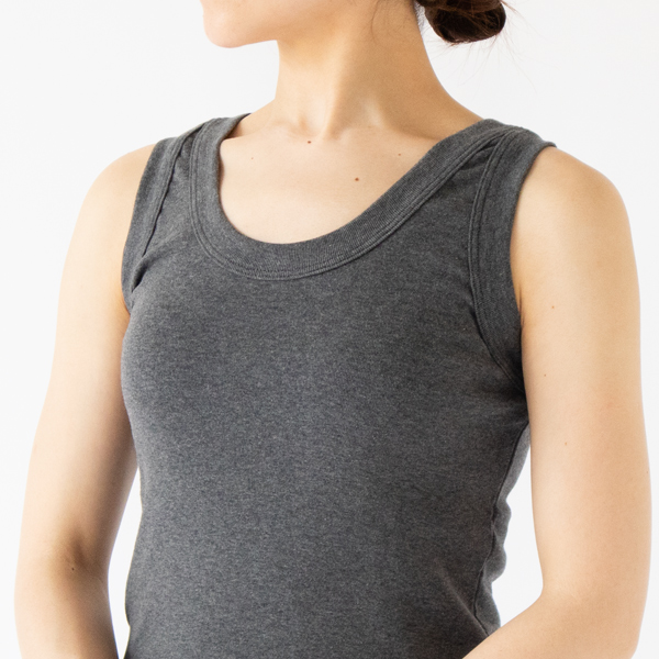 ベーシックな形のタンクトップで、肌心地の良さはインナーとしては心地良く、少し肉厚なフライス生地であるため一枚で着用しても透ける心配が少ないのがこのタンクトップです。伸縮のある生地は程よいフィット感と開き過ぎていないアームホール、深すぎない胸元で真夏の着用もしやすくなっています。暑さ対策は、薄着ではなく重ね着をすることが効果的。クーラーが効いた室内と屋外の温度差も激しい夏に、春は長袖と重ね着して活躍のアイテムです。