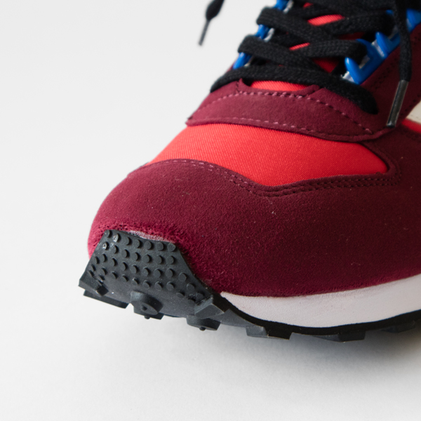 スニーカー Europeanは、フェルランニングモデルのPBシリーズをベースにロードランニング用のソールを組み合わせた普段使いのスニーカーとして活躍するモデル。フェルランニングとはイギリスではポピュラーなスポーツで、勾配のある丘陵地帯を走るオフロードレース。そのため通常フェルランニング用シューズは、ソフトで柔軟なアッパー素材に、硬く丈夫でスパイクのような凹凸のあるソールを組み合わせて作られていますが、こちらはソールを変えることで、動きやすさはそのままに、街中で快適に使えるスニーカーとして作られています。