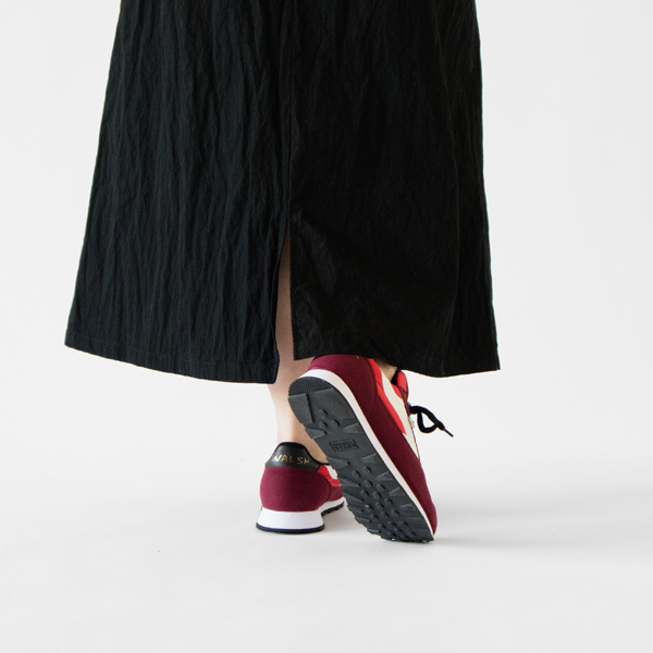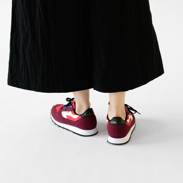 ちょっとレトロな雰囲気も感じるWALSH スニーカー European RED/WHT/BLKは、濃淡の異なる2色レッドにホワイトのラインが際立つ組み合わせ。シューレースホールにブルーを合わせているのもWALSH(ウォルシュ)らしさが感じられるポイントです。カジュアルな装いにはもちろん、ちょっとシックなモノトーンの装いに合わせてポイントにしたりと、普段のラフな場面だけでなく、おしゃれの外しアイテムとして着こなしの幅を広げてくれるスニーカーです。