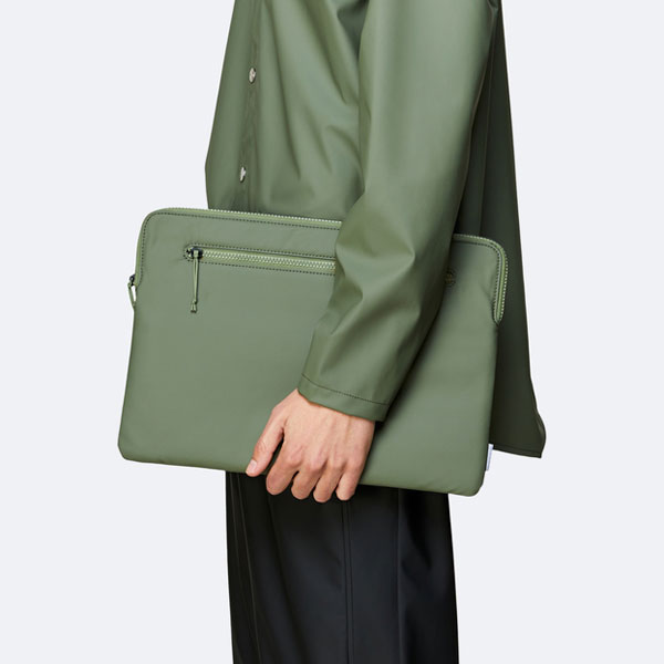 雨の日が楽しくなるようなレインウェアを幅広く展開するRAINSからパソコンを守ってくれるラップトップケースをご紹介します。飽きにくいシンプルなデザインのラップトップケースはふかふかとした手触りのしっかりとしたクッション性が印象的。それでいて厚すぎず程よい厚みなので、リュックに入れてもかさばりにくく、持ち運びに重宝します。表面はポリウレタン樹脂加工によって防水をしてくれるだけでなく、サラサラとして埃がつきにくい仕様。開けてみると中はふわふわの手触りで、ノートパソコンをしっかりと守ってくれる安心感が感じられます。サイドにはポケットもついていて、メモ帳をいれたり、コインケースやパスケースをいれたりと用途に合わせてお使いいただけます。A4の書類もしっかり入るサイズなので、荷物をあまり持ちたくない方のためのクラッチバッグとしても活躍しますよ。(一回り小さい13インチはこちら)
