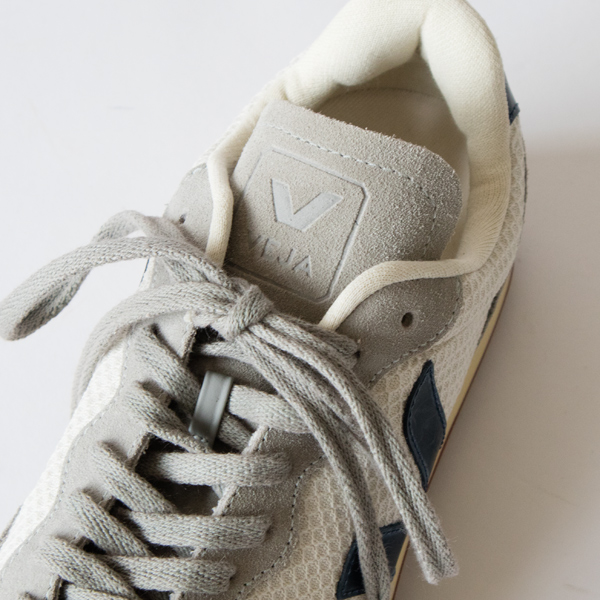 スニーカー RIO BRANCO / GRAVEL NAUTICO OXFORD GREYのアッパーには、HEXAMESH(ヘキサメッシュ)と呼ばれる2種類の糸を重ねあわせて織られたブラジル製のメッシュ素材を使用しています。ベースには耐久性のあるリサイクペットボトルの糸を使用し、表面はオーガニックコットンを六角形に編み込んだ生地で、VEJA(ベジャ)が取り組むアップサイクリングの取り組みから生まれた素材です。アップサイクルとは、使用されなくなった材料や製品をリサイクルして、より高品質またはより有用な製品に変えることで、VEJA(ベジャ)はリサイクルペットボトルだけで作られた生地を最初にスニーカーに使用したブランドでもあります。アッパー以外にも、ミッドソールにはサトウキビを53%使用し、アウトソールには42%バイオベース素材(12%のアマゾン天然ゴムと30%のもみ殻)と、全ての素材選びに妥協しない姿勢が伺えます。
