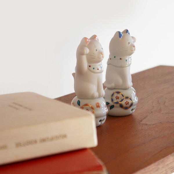 玄関の靴箱の上、本棚の一角、デスクの片隅。小さな鈴の上にちょこんと座る招き猫は、場所をとらずに、暮らしのどこにでもなじみます。新しい年の始まりに迎えるのはもちろん、引っ越しや新生活のお守りのような気持ちで。また、ただ「この顔が好きだな」と思ったときに。小さな手の中に宿る、上出長右衛門窯のまなざしを、日々の暮らしのそばで楽しんでいただければうれしいです。