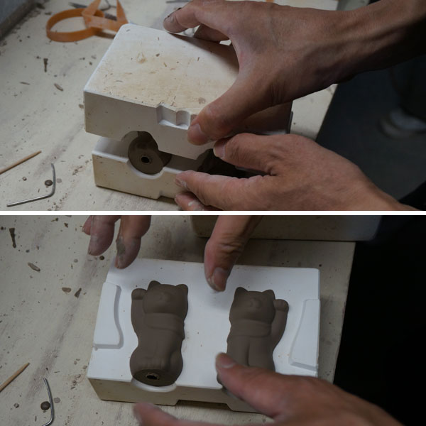 1. 猫と鈴、それぞれの型に陶土を流し込み、形をつくる。