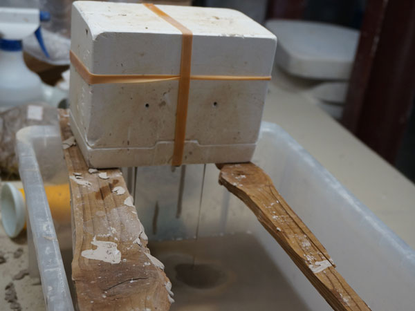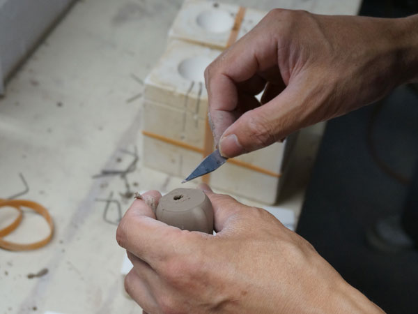 まず、液状の陶土を石膏型に流し込む工程から始まります。型の外側から固まっていき、ある程度時間が経つと、余分な陶土を出して中が空洞の状態をつくります。