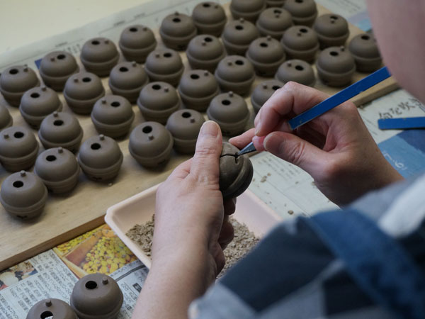 ▲招き猫の底面を整えている様子。