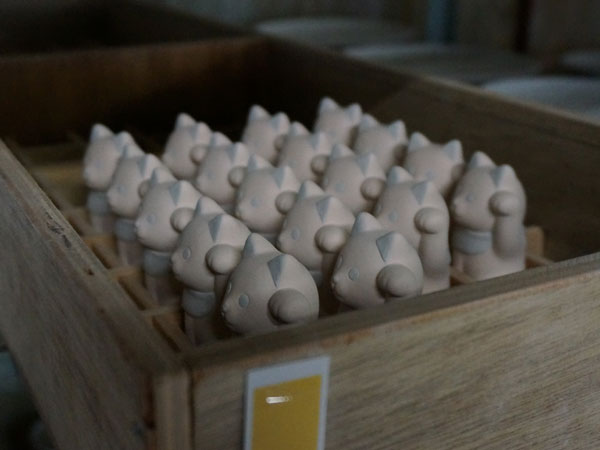 猫と鈴は別の型を使って作り、最後に鈴についた突起で接合するので、絵付け前の段階までは別々で進められていきます。